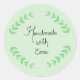 Handwritten and minimally designed Handmade With Care sticker in a mint green background. Ideal for small business that needs a personal touch.