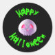 Un autocollant de crâne 3D mignon avec des yeux brillants et le texte "Joyeux Halloween" à utiliser pour les cadeaux, les cartes ou les enveloppes.