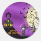 Happy Haunting Reaper Envelope Seals caractéristiques Haunted Halloween scène de nuit avec un dégradé ciel violet, jaune brillant lune derrière un arbre éffrayant silhouette & chauves-souris volant autour. Le reste de la scène est orné d'une faucheuse sombre avec une faucille sanglante et d'un chat noir portant un casquette de sorcières à côté d'une pierre tombale. Colorful Styliszed est Happy Haunting. Correspond à nos Invitations, Cartes de Voeux, Cartes Postales et Postage. Parfait pour les mailings Halloween. Cette conception a été créée à l'aide de artwork©delightful-doodles.com (http://delightful-doodles.com/) original