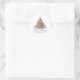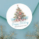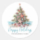 Sticker rond classique Arbre de Noël Plage. Étalez un peu de gaieté côtière avec cet autocollant rond festif avec un sapin de Noël inspiré de la plage fait de coquillages et surmonté d'une étoile de mer. Parfait pour envoyer des voeux de vacances en plage, cet autocollant est idéal pour toute personne vivant dans des endroits tropicaux comme Hawaii ou pour ceux qui aiment une ambiance côtière. Le design présente l'arbre centré sur une base de sable avec des vagues océaniques turquoises douces en arrière - plan. Sous l'arbre, "Happy Holidays" est écrit en écriture élégante, ajoutant une touche festive. Le style rustique de l'aquarelle et le mélange de typographie simple et de script lui donnent un aspect décontracté mais poli. Idéal pour décorer les enveloppes de cartes de Noël, les fêtes ou tout décor de vacances avec une touche tropicale.