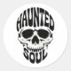 Bold black-and-white skull with curved 'Haunted'/'Soul' typography; high-contrast gothic motif for Halloween, rock, and streetwear fans seeking fearless edge.