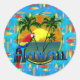 Coucher de soleil sur la plage d'Hawaii avec palmiers, cadre rond en bambou, perroquet coloré. Arrière - plan bleu océan avec motif de planches de surf rétro.