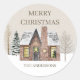 sticker "Joyeux Noël" avec une jolie vieille maison assise entourée d'arbres nus et de pins recouverts de neige. Personnalisé avec votre nom ou votre nom de famille.