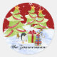 PALETTE DE COULEUR : Tendance moderne de Noël rouge et blanc avec chaux jaune, or, vert et rouge. COLLECTION DE DESIGN : Personnalisée avec votre propre nom de famille en utilisant le champ de modèle facile, vous pouvez créer vos propres étiquettes personnalisés, toppers de paquet ou scellés d'enveloppe. Il s'agit d'un autocollant fantaisiste, amusant, à thème Noël et hiver, d'un sceau ou d'un ensemble de décoration qui a été fait d'aquarelles peintes à la main d'Audrey Jeanne Roberts. Les arbres de Noël sont décorés d'une guirlande rouge drapée, de toppers d'étoiles tourbillonnantes en tas de neige avec des flocons de neige faits main tombant dans l'arrière - plan et un mignon manchot joue avec une pile de paquets emballés cadeau surmonté d'un arc rouge et d'un oiseau mignon et lunatique avec une queue tourbée. Ce design est disponible sur une large gamme de produits.