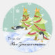 PALETTE DE COULEUR : tendance moderne de Noël d'Aqua Bleu et Blanc avec citron jaune, or, vert et rouge. COLLECTION DE DESIGN : Personnalisée avec votre propre nom de famille en utilisant le champ de modèle facile, vous pouvez créer vos propres étiquettes personnalisés, toppers de paquet ou scellés d'enveloppe. Il s'agit d'un autocollant fantaisiste, amusant, à thème Noël et hiver, d'un sceau ou d'un ensemble de décoration qui a été fait de pingouins peints à la main aquarelle d'Audrey Jeanne Roberts. Les sapins de Noël sont décorés d'une guirlande rouge drapée, de toppers d'étoiles tourbillonnantes en tas de neige avec des flocons de neige faits main tombant dans l'arrière - plan et un mignon manchot glisse sur une colline sur son ventre et un deuxième pingouin danse avec joie et un joli oiseau lunaire avec une queue tourbée assise sur un des arbres couverts de neige. Ce design est disponible sur une large gamme de produits.