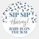 Sip Sip Hooray bébé est sur le chemin baby shower de préférence étiquette autocollant avec bleu et argent parties scintillant confetti motif. Parfait pour un baby shower pour décorer champagne ou bouteilles de vin.