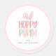 Hoppy Purim. Cute and colorful favor stickers, playful typography with bunny ear accent and spring pink pattern backing.