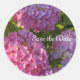 Belles hydrangées roses avec soleil brillant sur eux accent ce enregistrer la date autocollant pour votre jour spécial!