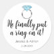 Ces autocollants disent, Il a finalement mis une bague dedans! avec une bague de fiançailles de diamant et les noms de la mariée et du marié avec la date du mariage ou du fiançailles. Les autocollants humoristiques parfaits pour une fête de fiançailles ou un faire-part mariage !