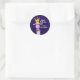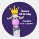 Anniversaire merci autocollant avec un lama géant soufflant une bulle rose tout en mâchant de la gomme. Portant une couronne d'or et une cravate d'arc noir. Arrière - plan violet foncé.