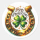 L'emblème en forme de fer à cheval doré, décoré de façon centrale avec un trèfle vert vif à quatre feuilles. Les mots "HAPPY ST. PATRICK'S DAY" est inscrit autour du fer à cheval dans une police de caractères, dessinée à la main, qui met l'accent sur le jour férié. L'image est symétrique et équilibrée, le fer à cheval englobant les mots et le trèfle dans un arrangement harmonieux.