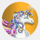Ce superbe autocollant de licorne dorée présente une licorne de couleur arc-en-ciel avec de grandes ailes dorées et roses et une crinière rose, bleue et violette. Elle a aussi une corne dorée rayée avec un éclat magique qui vient de son bout. Sous la licorne se trouve un arrière - plan doré brillant. Ces jolis autocollants auraient l'air de décorer n'importe quel cadeau pour les enfants ou les amoureux de licorne en général. Elles seraient aussi extraordinaires comme décorations pour n'importe quoi qui nécessite une touche de couleur et d'imaginaire.