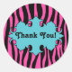 Un motif zèbre chic et glamour rayé en rose chaud girly avec une bannière bleue fantaisie dessus. Montré sur les autocollants de remerciement ronds.