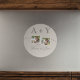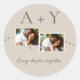 Une mise en page d'autocollants ronds avec deux petites photos reliées par une ligne pointillée, des initiales de serif au charbon de bois estampillées ci-dessus, et une citation de script ci-dessous. L'arrière - plan beige donne un ton doux. Un autocollant de mise en page de photo minimal conçu pour raconter des histoires significatives et partager des moments.