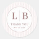 Cet autocollant de mariage élégant présente un design circulaire avec des bandes roses verticales en arrière-plan, encadré par un mince contour marron. Les initiales "L" et "B" sont affichées bien en vue en caractères gras serif, séparées par une ligne verticale, tandis que la phrase "MERCI" est écrite en dessous en lettres majuscules plus petites. Le style général est classique et formel, avec une palette de couleurs harmonieuse de roses doux et de marrons atténués, créant une ambiance sophistiquée et reconnaissante parfaite pour remercier les invités lors de votre événement spécial.