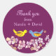 Whimsical, mignon oiseau baisant et fleurs avec un arrière - plan couleur prune conçu sur des Stickers de Merci de mariage personnalisés. (Vous pouvez trouver les essentiels et les faveurs mariages correspondants dans ce magasin, le paradis nuptial. Contactez ujean4791@gmail.com pour un travail personnalisé et/ou la coordination de la papeterie mariage.))