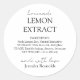 Étiquette professionnel conçu spécialement pour l'extrait de citron fait maison. Comprend des ingrédients frais pour le zeste de citron, des instructions d'entreposage appropriées et des directives d'utilisation. vinyle imperméable de haute qualité parfait pour l'utilisation en cuisine. Personnalisable avec le nom du fabricant pour le toucher personnel ou don.