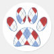 Empreinte de patte de chien de dessin en blanc, bleu et rouge. Des autocollants décoratifs pour les maisons et les entreprises comme les animaleries. Idée cadeau pour les amoureux de les chiens.