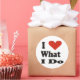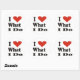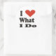 Gros autocollants ronds avec des lettres noires et un grand coeur rouge. "J'aime ce que je fais" scelle les paquets et les enveloppes.