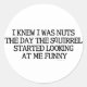 Je savais que j'étais fou le jour où l'écureuil a commencé à me regarder drôle. Drôle et stupide en disant d'être fou et écureuil. Jouez sur des mots avec des noix.