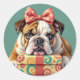 Un autocollant d'anniversaire amusant pour tous ceux qui aiment les bulldogs ! Un mignon Bulldog avec sa tête reposant sur un cadeau d'anniversaire.