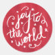 Calligraphie "joie pour le monde" est en blanc contre un arrière - plan rouge texturé à la peinture délicieuse. Des autocollants de fête conçus pour correspondre à notre Joy aux Cartes photos de Fêtes du Monde.