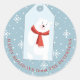 Moderne autocollant rond tendance saisonnier bleu et blanc avec neige qui tombe et un ours polaire blanc mignon avec une écharpe en laine rouge pour enveloppe ou papier cadeau.++++++++++ Personnalisez-le avec votre texte !