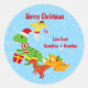 Un mignon sticker Festive Dinosaur de Noël montrant un mignon dinosaure de caricature portant des chapeaux santa et portant un cadeau ou des cloches avec le libellé Joyeux Noël sur le dessus, et un arrière - plan de fête neigeux bleu. Parfait pour ajouter comme autocollant de nom à n'importe quel cadeau de Noël pour enfants, surtout s'ils ont un amour pour les dinosaures. . Souhaite au destinataire un Joyeux Noël de grand-mère et grand-père (ou changer le message à votre propre).Personnalisez en ajoutant le nom de l'enfant.