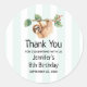 Anniversaire ou autre événement merci autocollants avec une adorable paresse accrochée à l'envers d'une branche d'arbre. La branche d'arbre est décorée de feuilles tropicaux et de baies. Placez-vous sur un arrière - plan vert clair et blanc.