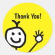 Design avec un joli visage souriant et une main agitant avec le slogan "Merci" Personnalisez facilement ce design en éditant le texte modèle ou en changeant la couleur arrière - plan d'un jaune vif. Merci d'avoir vu mes designs !