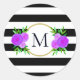 Sticker Rond Joli noir blanc rayé violet fleuri Monogramme