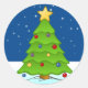 Sympa sapin de Noël en vert avec des ornements colorés et une étoile jaune. Neige blanche le long du sol et un arrière - plan de nuit étoilé foncé. Célébrez les fêtes avec une jolie décoration d'arbre de Noël. Tous les Designs Copyright © 2012 www.CuteComfy.com