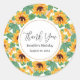 Anniversaire / Événement merci autocollants avec un motif d'été mignon. Joli tournesol jaune entouré de feuilles verts dans un motif répétitif. Un cercle (avec une fausse bordure d'or) superposé avec un nom/un texte personnalisé à l'intérieur.