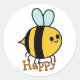 Une adorable abeille à rayures noires et jaunes, ailes bleues, joues roses et un sourire joyeux. Elle porte le mot heureux qui est dans un texte de couleur orange avec un contour pointillé.