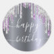 Un anniversaire tendance et glamour. Un faux métal argenté, un arrière - plan à l'allure de papier peint décoré de gouttes de parties scintillant violet et faux argent, la peinture goutte à goutte. Texte de couleur blanche : Joyeux Anniversaire est écrit avec un script de style à la main moderne avec des swashes.