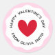 Autocollants ronds représentant un cœur rouge entouré de texte personnalisé "Joyeuse Saint-Valentin" et votre nom avec une bordure ondulée rose clair.