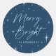 Des autocollants de vacances modernes avec "Joyeux et brillant" exposés dans un script écrit à la main, cerné par une bordure d'étoiles blanches contre un arrière - plan de la marine. Personnalisez les stickers joyeux et lumineux en ajoutant votre nom de famille ci-dessous. Les autocollants fonctionnent très bien comme les scellés d'enveloppe, pour sceller les sacs de faveur, et plus encore!