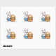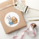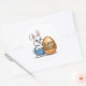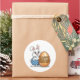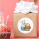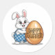Happy Polka Dot Bunny Classic Round Sticker de Pâques. Le mignon lapin, portant des boules de pois bleues et blanches, tenait fièrement un oeuf de Pâques qui disait "Bonne Pâques", en train de frapper une pose comme si elle auditionnait pour "Lapin de l'année !"