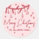Autocollant rond pour les fêtes. Cet autocollant rond joyeux présente une guirlande de verdure de pin et d'ornements suspendus le long du haut, avec des étoiles éparpillées ajoutant une touche ludique. Sur un fond rose tendre, « Joyeux Noël » apparaît en élégante écriture rouge près du centre, tandis qu'un nom ou une ligne de texte est affiché en bas dans une police rouge propre.