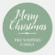 Un autocollant cadeau de Joyeux Noël simple et moderne ou sceau d'enveloppe avec le texte Joyeux Noël en calligraphie manuscrite chic blanc sur un arrière - plan vert vintage. Ajoutez simplement votre nom de famille. Conçu exclusivement pour vous par Happy Dolphin Studio. Si vous avez besoin d'aide ou de produits correspondants, veuillez nous contacter à happydolphinstudio@outlook.com .
