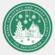 Joyeux Noël Joyeux Vacances Hiver Personnalisé Nom Stickers Étiquettes présente le texte "Joyeux Noël et Joyeux Vacances" dans un script blanc moderne sur un arrière - plan vert et personnalisé avec votre nom autour d'une maison avec des arbres de Noël et des flocons de neige. Parfait pour les fêtes de Noël et les cadeaux de Noël ou au bureau pour les produits ou le courrier. Conçu par ©Evco Studio www.zazzle.com/store/evcostudio