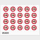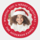 Des autocollants ronds et rouges avec le texte personnalisable "Je vous souhaite un joyeux Noël" et votre nom autour de votre photo à l'intérieur d'une bordure ondulée.