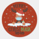 Célébrez et commémorez ce Noël 2020 et décorez vos cadeaux ou enveloppes avec cet autocollant rond amusant avec un charmant renne de bande dessinée avec un casquette rouge, un masque et un désinfectant à la main, décoré de flocons de neige. La légende du mot pun indique Joyeux Noël 2020 en noir et vert toutes les lettres casquettes.