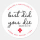 Mais êtes-vous mort ? Kit de secours contre la gueule de bois ! Ces autocollants amusants de cadeau pour enterrement de vie de jeune fille sont parfaits pour créer vos propres kits de récupération de gueule de bois pour vos invités, essentiels si vous prévoyez un week-end entre filles. Visitez notre collection de cadeaux pour enterrement de vie de jeune fille, cadeaux de mariage, et kits de gueule de bois et souvenirs de mariage. Personnalisez avec le nom et la date. COPYRIGHT © 2020 Judy Burrows, Black Dog Art - Tous droits réservés. Kit de secours contre la gueule de bois Autocollant rond classique personnalisé Mais êtes-vous mort ?