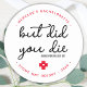 Mais es-tu mort ? Kit de secours contre la gueule de bois ! Ces autocollants amusants de cadeau de jeune fille sont parfaits pour créer vos propres kits de récupération de gueule de bois pour vos invités, essentiels si vous prévoyez un week-end entre filles. Visitez notre collection de cadeaux de jeune fille, de cadeaux de mariage, de faveurs de kit de gueule de bois et de souvenirs de mariage. Personnalisez avec le nom et la date. COPYRIGHT © 2020 Judy Burrows, Black Dog Art - Tous droits réservés. Kit de secours contre la gueule de bois Autocollant rond classique personnalisé Mais es-tu mort ?