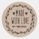 Un autocollant personnalisé "fait avec amour" sur un arrière - plan de couleur kraft entouré d'une couronne de laurier. Faites-le le vôtre en ajoutant votre propre nom. Une jolie touche de finition pour tous vos cadeaux faits main. Conçu pour vous par Blackberry Boulevard.