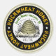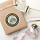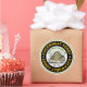 Colorful drawing of a vintage skep beehive with bees flying about, personalized with the type of honey and your professional business name, address and net weight of the honey. Add extra spaces between the words of the round text to adjust the position on the broer. Change the background color when you choose a different Design Theme. ⬢ The skep was made of straw or wicker, oft covered in mud, and used in the late Medieval period, before the discovery of the "bee space" and subsequent invention of the modern stroth, Top-bar or Warre bee hives. Because harvesting honey from the skep destroys the hive and upsets the bees, these types of hives are seldom used, but the symbole carries on.