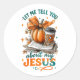 Design paisible et coloré avec une scène automne / automne avec un livre ouvert, citrouille et café. Le texte inspirant et coloré dit : "Laissez-moi vous parler de mon Jésus". Ce design est disponible sur une grande variété de produits.