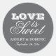 Les autocollants fantaisistes de mariage en forme ronde "L'amour est doux" en blanc ivoire clair avec un monogramme des noms de mariée et de mariée et la date mariage et avec un arrière - plan gris charbon.