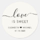 Chic crème légère autocollant pour vos faveurs de mariage avec "l'amour est doux" en lettres simples et un script élégant avec des swashes, vos prénoms unis par un coeur et votre date mariage.
